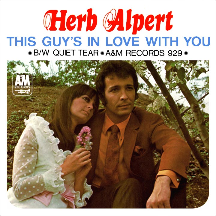 CBS television (the former owners of Chaplin's studio lot who had sold the property to Alpert and Moss for a cool million in cash) offered Herb a chance to do a one hour special. Singer Presents Herb Alpert & the Tijuana Brass, sponsored by the 100-year-old sewing machine company, aired in April 1967. Opening in a bullfighting arena, it also featured a segment in the former Chaplin studio. On a second variety special, The Beat of the Brass in April '68, Herb sang a new Bacharach-David song, "This Guy's in Love With You," to his wife Sharon, who appeared with him (they divorced a few years later after 15 years of marriage, the song's impact apparently worn thin by that time). The song was a sensation; released as a single post-broadcast, it shot to number one, a first for A&M and its already highly successful composers (by rare coincidence, fellow trumpeter Hugh Masekela's instrumental "Grazing in the Grass" knocked the record off the top after four weeks). In July, companion release The Beat of the Brass became the fifth number one album for Alpert and the Brass (to that point only the Beatles and Elvis Presley had more number one albums).