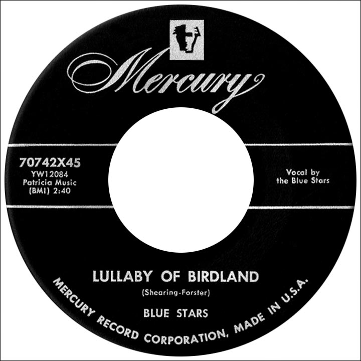 She made some instrumental piano recordings but preferred singing. After moving to Paris in the mid-'50s, Dearie became an original member the Blue Stars. The four-man, four-woman act (whose number varied in later years) recorded "Lullaby of Birdland" in 1955. Group singer Bob Dorough contributed a nifty, two-note piano solo (with flourishes) on the track and Dearie's vocal contribution is discernible within the skillful eight-member vocal performance. The recording was given a big band treatment by arranger Michel Legrand (later known in the U.S. for "The Windmills of Your Mind" from The Thomas Crown Affair and the original film score of Summer of '42, both Academy Award winners). Released on Mercury, "Lullaby of Birdland" spent five months on the charts in America and hit the top 20 in February 1956.