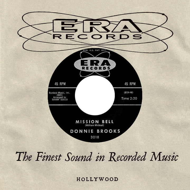 Johnny settled in at Era in '59, recording the change-of-pace "Li'l Sweetheart," the first under what would be his permanent moniker, Donnie Brooks, suggested to him for the "riotous" reason already alluded to. Few people connected this Brooks guy to his earlier aliases...assuming they'd even heard any of the songs. The next single, "White Orchid," a somber, spoken "teen death" record, had some minor success that fall on the west coast (particularly in Portland, where it went top ten, which explains why I've been seeing the 45 in record bins for years). Afterwards, the uptempo (but not nearly as frantic as earlier non-Donnie efforts) "The Devil Ain't a Man" failed to generate enthusiasm. He hit pay dirt with "Mission Bell" (originally titled "Wishing Well"), written by William Michael (an earlier Johnny Jordan song, "Sweet, Sweet, Sweet," was his as well) with at least one added line ('...taller than the tallest tree...,' inspired by pal and belated labelmate Burnette's recent hit "(There Was A) Tall Oak Tree"). After a slow, steady two-month climb, the single reached the top ten in August 1960.