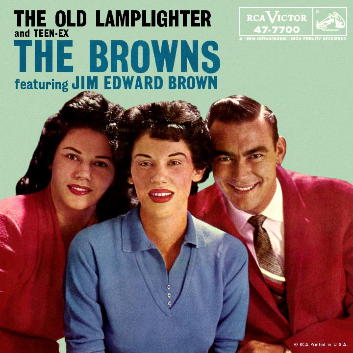 Older songs got the Browns treatment and the next two were major hits. "Scarlet Ribbons (For Her Hair)," written in 1949 by Evelyn Danzig and Jack Segal and popular at the time by Jo Stafford, was even bigger when the Browns remade it ten years later. "The Old Lamplighter," penned by Nat Simon and Charles Tobias, had gotten Sammy Kaye to number one in '46 and provided the Browns with another top ten pop hit in the spring of 1960. With this release, "featuring Jim Edward Brown" followed the group name as RCA began prepping the lead singer for something bigger. Softer "Nashville Sound" productions alternated with quirkier fare, including Boudleaux and Felice Bryant's "Teen-Ex," concerning a high school couple's marriage and annulment, and Homer and Jethro's rural retelling of catching and eating a "Ground Hog." In 1963, the trio joined the Grand Ole Opry, which led to a Grammy nomination the following year in the fiercely competitive category Best Performance by a Vocal Group; they were up for the album Grand Ole Opry Favorites, but the award went to The Beatles for A Hard Day's Night.