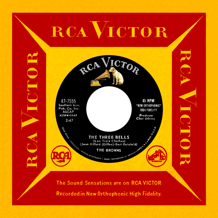 The trend towards soft-vocal one-man-two-woman acts reached its apex in April 1959 when The Fleetwoods, a pop trio from Olympia, Washington, hit number one with "Come Softly To Me." That summer, as new top 40-formatted radio stations were signing on almost daily in cities across America, the Browns crossed over to the pop charts with "The Three Bells," an abbreviated version of what Les Compagnons had done in English seven years before. Competition came from a cover on Monument by Philadelphia-born singer Dick Flood (with the full set of lyrics), but it was no contest. In August, "A Big Hunk O' Love" by former tourmate Elvis was knocked off the number one spot by the Browns' "Three Bells," which ultimately became one of 1959's best-selling singles.