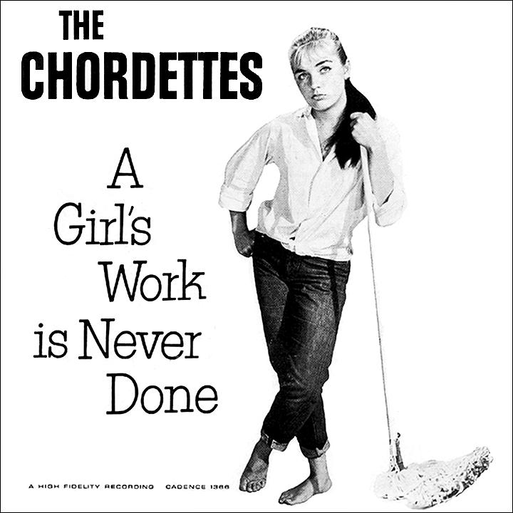 The quartet came closest to rock and roll with both sides of the next single. "A Girl's Work is Never Done," their summer '59 answer to The Coasters' chart-topping "Yakety Yak," tells the chore-time tale from the toiling teenager's viewpoint; sax player supreme King Curtis supplied the signature sound as he'd done for the Coasters. The flip side, "No Wheels," obviously inspired by Edd Byrnes' "Kookie" character from 77 Sunset Strip (and hit single "Kookie, Kookie (Lend Me Your Comb)"), finds the Chordettes in the background; Jeff Kron, a classmate of Jackie Ertel (Janet's daughter from a previous marriage) supplied the spoken Byrnes imitation and Jackie added some 'No, no, no!' lines of her own. A promotional film featuring both songs was produced for screening in theaters and use on TV variety shows, amounting to a very early example of the music video concept.