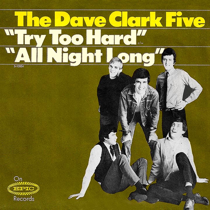 The hits kept coming: "Come Home," a Clark-Smith ballad, was followed by Chuck Berry's "Reelin' and Rockin'" and Chris Kenner's "I Like it Like That" (top ten for the DC5 as it had been for Chris), benchmark rock/rhythm songs that paved the way for more. Having a Wild Weekend's original title song "Catch Us if You Can" went top ten in September '65, then a remake of the 1958 Bobby Day hit "Over and Over," in the final week of December, gave the Dave Clark Five that elusive number one U.S. hit they'd been seeking. "At the Scene" (as with "Catch Us," written by Dave and Lenny), "Try Too Hard" and "Please Tell Me Why" (both by Dave and Mike), all trademark DC5 rockers, were big in the early months of 1966. A pair of Clark-Payton tunes, ballad "Satisfied With You" and its polar opposite, screamer "Nineteen Days," were lesser hits and left some wondering at the close of 1966 if the group was running out of steam.