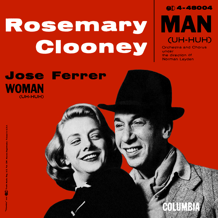 The red-hot singing star became a fixture of Hollywood society, which led to a series of duets, first and foremost her summer 1952 hit with screen siren Marlene Dietrich, "Too Old to Cut the Mustard," a playful put-down on men (whether or not they literally qualified as geezers!), followed by "The Night Before Christmas Song" with "Singing Cowboy" Gene Autry and an appropriately cartoonish audio depiction of Hank Ketcham's "Dennis the Menace" featuring Jimmy Boyd as the title slingshot shooter. In July 1953, Rosie married Oscar-winning Cyrano de Bergerac star Jose Ferrer, a union that spawned the late-'53 novelty hit "Woman (Uh-Huh)" (by Jose) with "Man (Uh-Huh)" by Mrs. Ferrer on the flip. Over the course of their 17-year marriage, the couple had five children including well-known actor Miguel Ferrer.