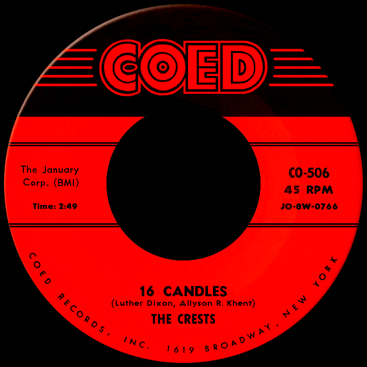 Then the breakthrough came. While the early sides focused on group harmony, "16 Candles" highlighted Johnny's lead. Luther Dixon (who'd established himself over the previous two years writing hits for the likes of Pat Boone, Perry Como and Nat "King" Cole) composed the song with newcomer Allyson R. Khent, capturing the zeitgeist of the era's youth with cleverly contrived phrases like 'You're only 16, but you're my teenage queen' and '16 candles in my heart wil glow, forever and ever for I love you so.' Released in November 1958, the single began its national climb the week of Thanksgiving, broke into the top 40 just before Christmas and moved steadily to a number two peak in February '59. "Lovin' Up a Storm" by Jerry Lee Lewis was a notable Dixon-Khent collab before he moved into a position with Scepter Records (becoming a key player in The Shirelles' success) while she continued composing songs for the Crests with various collaborators.