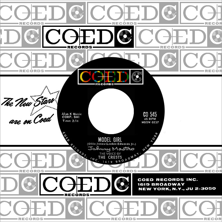 The next three singles, all charting efforts, were credited to the Crests featuring (or with) Mastro. Afterwards he went solo, like it or not, as Johnny Mastro with the label notation "The Voice of the Crests." Ollie Jones' "Model Girl" was a top 20 hit and its follow-up, "What a Surprise" (the first to show his name as Johnny Maestro), reached the top 40. These weren't Crests records per se, though J.T., Tommie and Chico sang on some of the recordings. Summer single "Mr. Happiness," with female singers, was billed to Johnny Maestro and the Coeds. The leftover Crests recruited a new lead, Tony Middleton, who appeared on only one single, "Baby I Gotta Know," their swan song for Coed in late '61. Johnny, who wasn't happy about being distanced from his longtime friends and musical partners, left the company within a matter of weeks. But the damage had been done; the experience, with its two-year peak and inevitable downfall, had created a difficult-to-mend rift between the childhood friends.