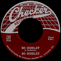 It wasn't until he was 26 that Bo finally made a recording...on a home tape machine. He took this raw demo of "Bo Diddley" to Vee-Jay, a relatively new Chicago label that was starting to have some success with bluesman Jimmy Reed; A&R man Ewart Abner was appalled by it. So Bo worked up the courage to go to VJ's more seasoned competitor. Chess Records founders Leonard and Phil Chess heard something unique in his style and scheduled studio time to record a more polished version. Lyrics were somewhat nonsensical, as street-inspired songs can sometimes be: 'Bo Diddley buy his baby diamond ring...if that diamond ring don't shine...he gonna take it to a private eye...if that private eye can't see...he better not take the ring a-from me...' The flip side, "I'm a Man," was more about adult posturing: 'All you pretty women, stand in line...I can make love to ya baby, in a hour's time...I'm a man...spell m-a-n...man!' This debut single, on the Checker label, was a double-sided smash, reaching number two on the R&B best seller chart in June, its momentum eclipsed by Fats Domino's mega-hit "Ain't it a Shame" (though it did reach the top of the Most Played in Juke Boxes list). Immediately, Muddy Waters reworked "I'm a Man," retitled it "Manish Boy," and had a hit with his version a few months later. Meanwhile, Buddy Holly covered "Bo Diddley," though his version sat on the shelf until 1963, four years after his unforeseen death.