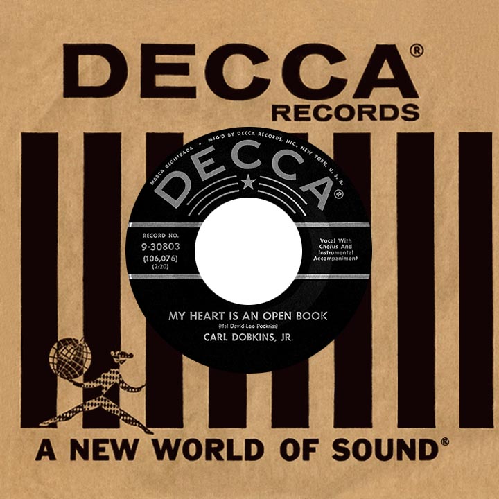 Prolific pop songwriters Hal David and Lee Pockriss composed "My Heart is an Open Book," recorded in the fall of 1958 by minor (but later bigtime) Columbia Records country star Jimmy Dean, but it wasn't the breakthrough Jimmy had hoped for. Though he wasn't impressed with the song, a high school student from Cincinnati named Carl Dobkins, Jr. took a stab at it anyway at producer Owen Bradley's suggestion. It appeared to be going down the same incinerator chute as Dean's version but gradually caught on, the benchmark of Carl's one big year that brought him another hit, lots of television exposure, a hectic touring schedule and a contrived nickname, "The Teenage Rage."