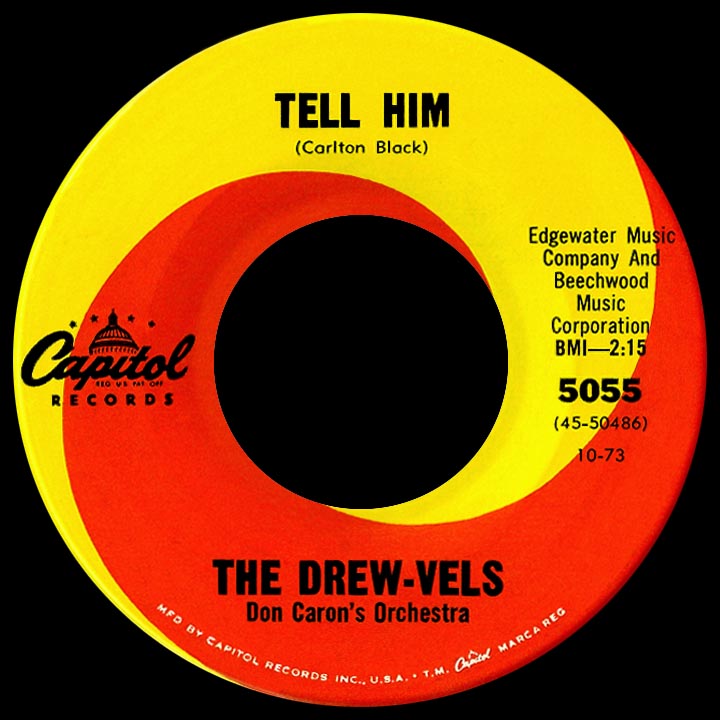 The three older siblings made an audition tape that included "Tell Him" (originally "Tell Her"), a song written by Carlton for his group. Convinced he'd found something worthwhile, Maury tipped off Peter Wright and his business partner Don Caron, a Chicago-based bandleader who had his own production company. A plaintive ballad ('...if you ever find that love of mine...tell him to forgive me...') in stark contrast to the major hit of the same title from several months earlier by The Exciters of Queens, New York, the song was recorded at a local studio and released on Capitol under the name The Drew-Vels in the fall of '63, an outstanding debut effort with Carlton's 'bom-bom-ba-doo-doo-doo' bass and a moving lead vocal by Patricia (professionally known as Patti Drew from this point on). Hometown radio led the way in December 1963; it hit the top 20 in Chicago the following month and made a strong showing in several west coast cities in February and March 1964, resulting in a brief appearance on the lower rungs of the national charts.