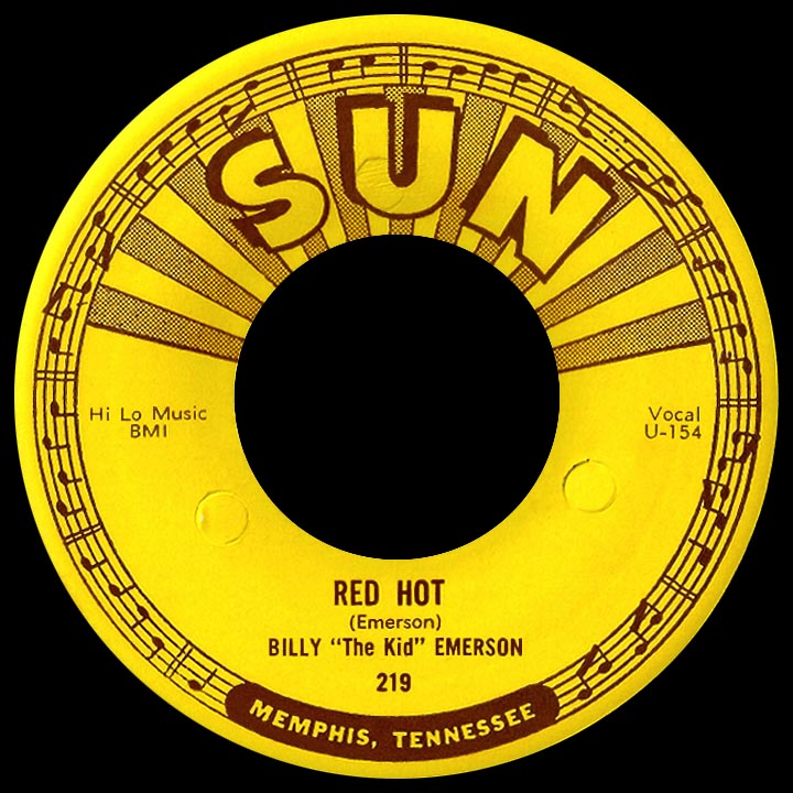 As for Billy "The Kid" Emerson's most famous recording, "Red Hot," it has taken on a life of its own. A wild, rockin' version by Sun's Billy Riley and The Little Green Men came along in late 1957, considered by some the definitive version (a nickname, "Red Hot Riley," resulted); Bob Luman immediately hit the street with an even more deranged rendition on Imperial, seemingly designed to one-up Riley at his own game. Cameo Records released The Carroll Brothers' "(My Gal Is) Red Hot" in the spring of '58, a pop-rock version with the same tune and opening line but otherwise different lyrics. Ronnie Hawkins' "My Gal is Red Hot," from his self-titled 1959 album on Roulette, is lyrically closer to the original, but neither this nor the Carroll recording gave songwriter credit to Emerson. Sam the Sham remained faithful with his garagey rave-up from '66 and gave proper credit to the song's creator, as did rockabilly revivalist Robert Gordon when he and guitar legend Link Wray exposed the song to a younger fan base in 1977.