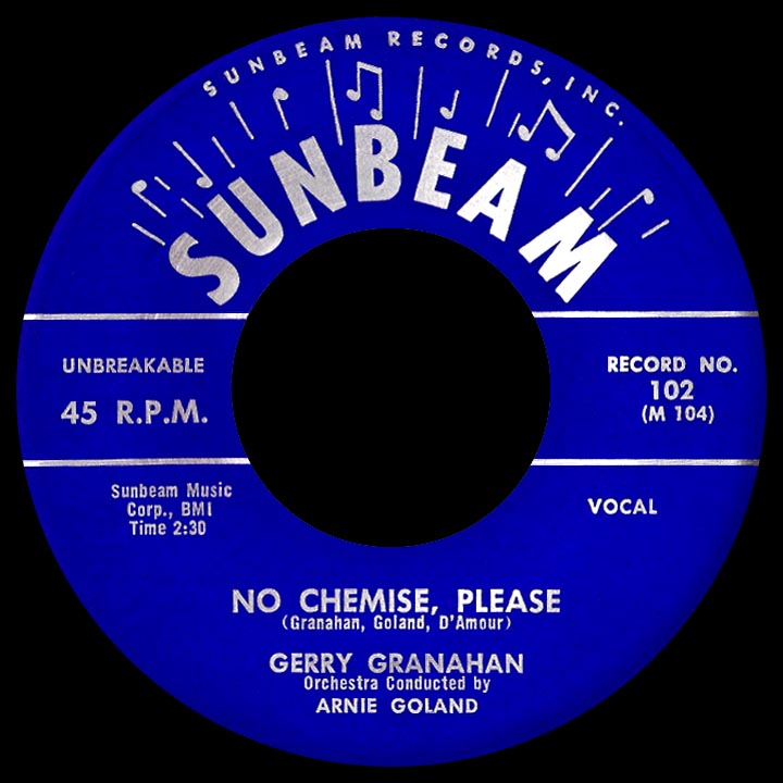 His deal with Atlantic had ended somewhat abruptly, at which point he ditched the Jerry Grant moniker for his given name. Teen tune "Love's Young Dream" failed to make a even a minor impact for the struggling Mark label. Granahan waxed yet another pleasant ballad, "Girl of My Dreams," flipping it with the farcical "No Chemise, Please," which he'd written with producer Arnold Goland and sometimes-chemise-attired Jodi D'Amour (a glamorous "Copa Girl" at the Sands Hotel and Casino in Las Vegas). A mildly humorous criticism of the baggy "sack dress" fad of the time, Gerry hammed it up, delivering lyrics like '...now she's got a shape like an egg!' and 'Well you can take back the sack, leave it hangin' on the rack and bring the sweater back!' The timing for this single on the new Sunbeam label couldn't have been better; it made the top 30 in June, at the same time Dickey's "Flip Top Box" topped out several rungs below. The anti-chemise sentiment was apparently heeded, as sack dresses fell out of favor with fashion-conscious females shortly afterwards.