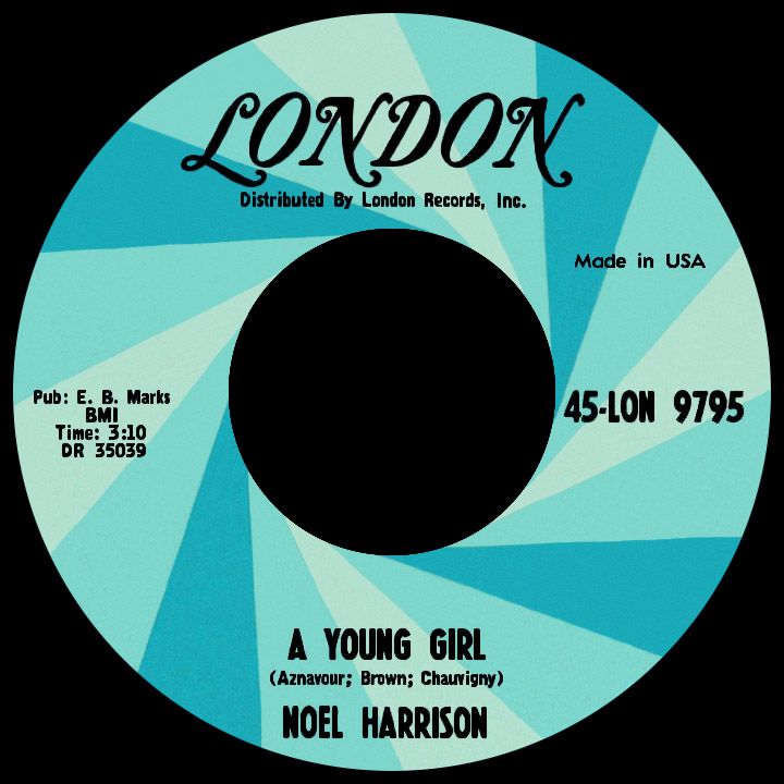 Noel's casual vocal style was then fused with a set of unflinchingly powerful, though poetic, lyrics. "A Young Girl," originally a French poem-turned-song ("Une enfant") by Charles Aznavour with music by Robert Chauvigny, was first recorded by Édith Piaf in 1951 and later given English lyrics by Chicago singer-songwriter Oscar Brown Jr., who recorded his version for Columbia Records in 1963. The story tells of a girl who meets a boy who gives her '...vows of love she'd never heard, and she believed his every word...' then leaves her home in a rich neighborhood: '...although she realized she'd sinned, she threw caution to the wind.' Harrison's recording had a more rocking background (though still understated to match his delivery of the lyrics). Then came the unsettling ending: 'A young girl of sixteen...child of springtime, still green...lying here by the road...dead.' Released in the fall of 1965, the record was a very big hit in many radio markets and, not surprisingly, a no-show in many others. Noel's first single to make an impact, it peaked mid-chart on Billboard and reached the Cash Box top 40 in early January '66. Decca put any hesitation aside and released it in the U.K. that same month under the title "A Young Girl of Sixteen." The song was largely ignored.