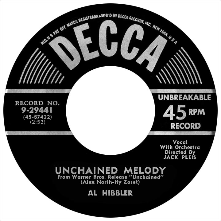 The biggest hit of Hibbler's career came right after he signed with Decca Records in 1955. "Unchained Melody" was introduced in a low-budget prison film, Unchained, based on the 1952 nonfiction book Prisoners Are People by Kenyon J. Scudder; a version of the song slightly over a minute in length was sung in the film by Todd Duncan, an actor and singer whose greatest success had come as the star of the original 1935 Broadway production of Porgy and Bess. Les Baxter's vocal chorus recording of the song (with the word 'unchain' added, which was not in the original or most versions), entered the charts in April '55, followed closely by Hibbler's and Roy Hamilton's covers; Baxter reached number one on disc jockey charts and all three were top ten in the best sellers that spring. It was a natural for Hibbler; his vocal style was closest to Duncan's and he landed at number one on the R&B chart in June, following Hamilton, who'd topped the chart in May. Songwriters Alex North and Hal Zaret received an Oscar nomination for Best Song and a staggering number of remakes through the years have made "Unchained Melody" one of the most popular musical compositions of all time.