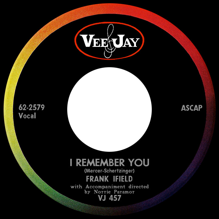 Whiplash, a western TV series produced in England, set in Australia and starring American Peter Graves, premiered in the U.K. in the ATV network and ran a full season; Ifield performed the title theme. Besides the weekly airing of this song, 1961 proceeded quietly with four unsuccesful single releases including a cover of Jerry Wallace's "Life's a Holiday" and an original Frank had written, "Your Time Will Come." In the summer of 1962 Ifield, in danger of being dropped by EMI, slipped a slight yodel into "I Remember You," a song written in 1941 (music by film director Victor Schertzinger), its lyrics penned by Johnny Mercer, who later revealed he wrote it for Judy Garland, his love interest at the time. 21 years later, Ifield's version suddenly became one of Britian's all-time top-selling records. Despite a seven-week run at number one and million-selling status in Britain, the song met with resistance from potential distributors in the States. Vee-Jay Records, primarily a rhythm and blues label based in Chicago, took on the record, which reached the top five on the Hot 100 in October, as well as number one on the Easy Listening chart.