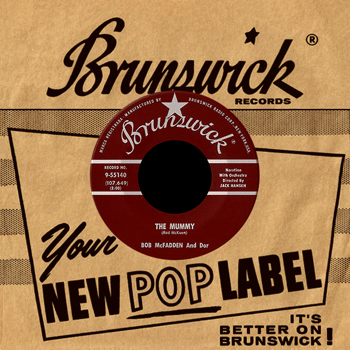 McKuen got involved, contributing a more humorous and timely ditty called "The Mummy," spoofing the legend rooted in ancient Egyptian culture, not as yet the subject of a hit single. Boris Karloff's movie monster was childishly caricatured and updated to a trendy late-'50s setting, when nightclubs featuring hot jazz musicians and theaters showing schlock horror movies were often found on the same city block. McFadden's cartoonish Mummy proudly proclaims 'I scare people,' honking his toy horn as passers-by run screaming down the street to the beat of a drum-and-saxophone backing along the lines of "The Blob" and the earlier "Tequila" by The Champs; the singular reason for the bandage-wrapped misfit's rise from the dead after 1,959 years being to '...buy a copy of Kookie, Kookie, Lend Me Your Comb,' alluding to the early-'59 novelty hit by self-absorbed hipster Edd Byrnes. Enter beatnik McKuen, replying to the Mummy's insistence that 'People are afraid of me!' with an unfazed 'Yeah, I'm hip.' Brunswick released the single that summer, crediting Bob McFadden and Dor (that's Rod backwards). It honked its way into the top 40 in mid-September and, oddly, fell off the charts just before Halloween. Perhaps trick-or-treat aficionados reacted to the the Mummy's question 'Aren't you gonna scream?' in a way similar to Rod's cool-cat character: 'Oh, yeah...like, help.'