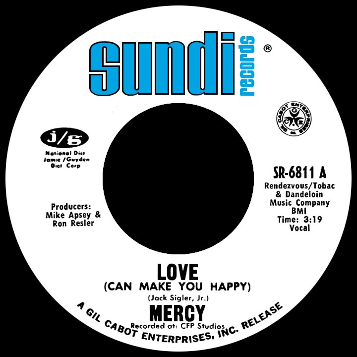 Cabot figured "Love (Can Make You Happy)" was the one good thing Fireball Jungle had going for it, so he pressed up some Sundi 45s with "Fire Ball," a fierce fuzz-guitar instrumental by Caudill (but credited to Mercy) on the flip side. In November 1968 the "Love" side got a little airplay down the road and around the bay at Sarasota's WYND. No other stations seemed interested. Jack joined the Navy, but Cabot didn't give up so easily. He cut a deal with Jamie/Guyden Records of Philadelphia for national distribution; the record broke first in Miami in early 1969, then Philly stations came on board due to Jamie's promotional efforts. Soon Jack's love song that rhymes 'air' with 'there, cares' and 'share,' was poppin' from coast to coast.