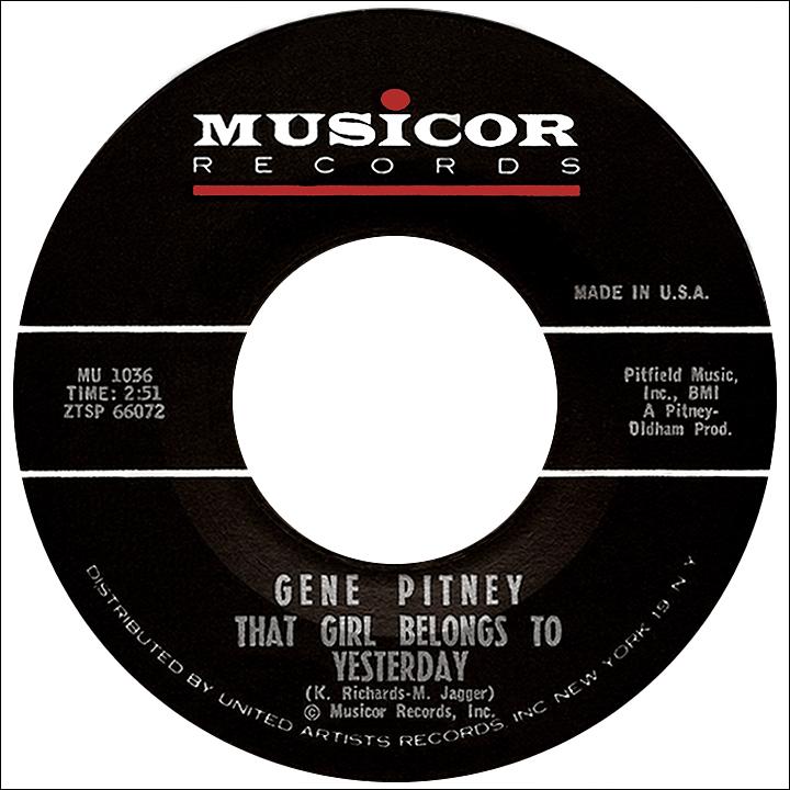 At the very beginning of 1964, Gene was part of another historical unlikelihood. His records had been quite successful in England by this time; he and Phil Spector made a trip overseas in the fall of '63. After being introduced to The Rolling Stones by their manager Andrew Loog Oldham, he recorded the Mick Jagger-Keith Richard song "That Girl Belongs to Yesterday" and it first appeared on the charts in America the third week of January, 1964. Up until this time the Stones had placed only a couple of minor hits on the British charts. It was Gene who provided the gateway to America for the blues-inspired band, and incredibly that single appeared the same week future Rolling Stones rivals/friends The Beatles debuted with their (much, much bigger) initial U.S. hit "I Want to Hold Your Hand." A few months later, Gene was invited by Mick and the boys to join them during the recording sessions for "12 x 5," and he played piano on at least one of the album's tracks.