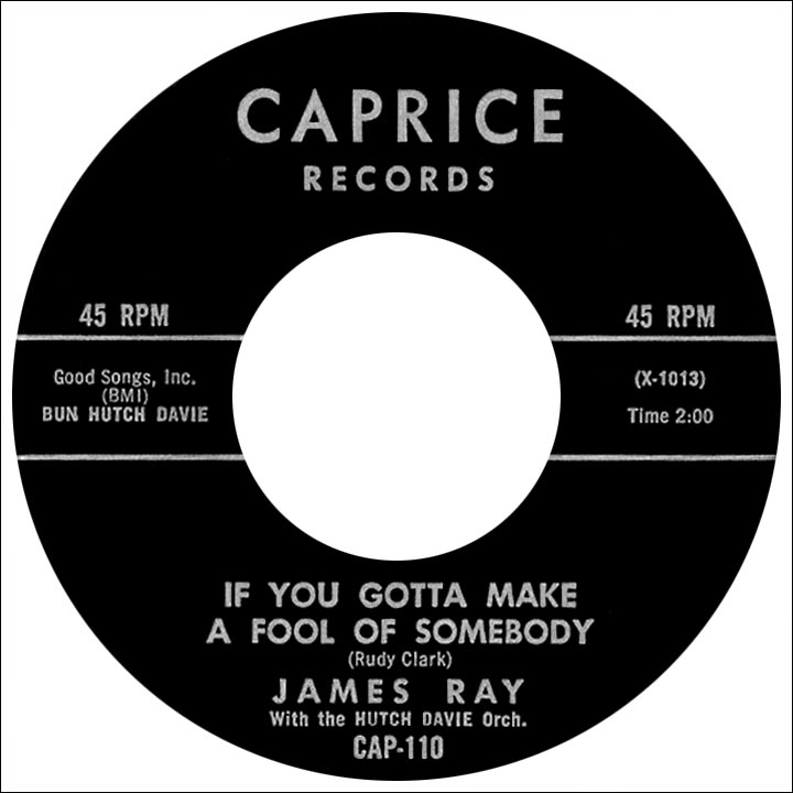 James pounded the Big Apple pavement for many months after that one unsuccessful bid, occasionally working in small nightclubs but mostly singing on street corners and, for a time, living on the streets. A music-obsessed mailman, Rudy Clark, saw him in a club in 1961, which ultimately worked in James's favor. When Gerry Granahan, founder of the recently-established Caprice Records, showed interest in some of Clark's songs but didn't feel he had a voice for recording, Rudy tracked down James, who'd been sacking out on the roof of an apartment building, and took him to audition for Granahan. Caprice had gotten off to a good start that year with hit singles by a pair of female acts from New Jersey, Janie Grant ("Triangle") and The Angels ("'Til"). Taking a simplified and less juvenile name, James Ray scored the label's third big hit.