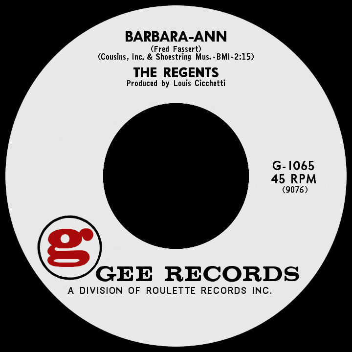 The Regents reunited as soon as the nearly-three-year-old recording began getting airplay. In May '61 it hit number one on New York's powerhouse radio station WABC ("channel 77"). The vocal group revival was particularly strong there as fans sang along in cars, on apartment fire escapes and in local hangouts: 'You got me rockin' and a-rollin', rockin' and a-reelin', Barbara Ann, ba-ba-ba-Barbara Ann!' Cicchetti, overwhelmed by the sudden demand, leased the master, such as it was, to Roulette Records. The single, on the Gee label, took off nationally, reaching lucky number 13 on both Billboard and Cash Box in June while peaking at an even luckier number seven on the R&B charts.
