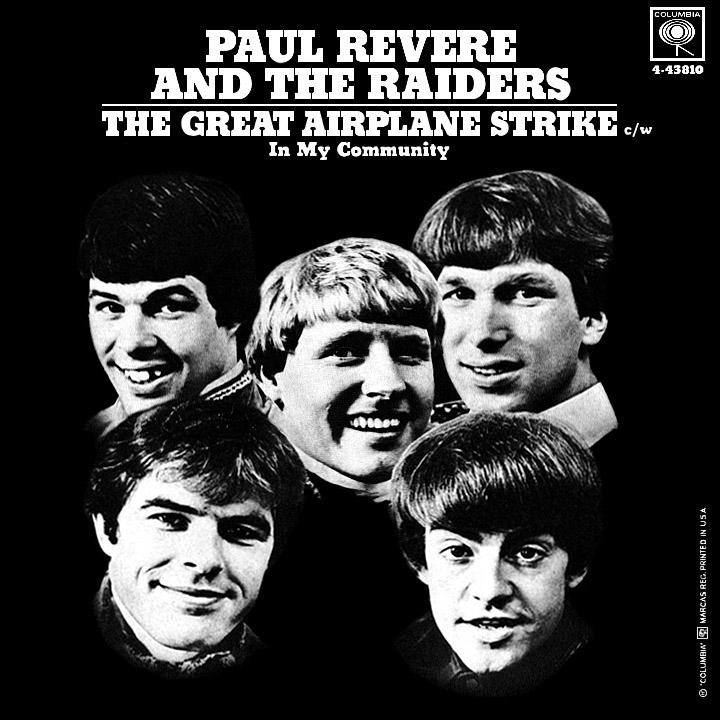 A side project by a mysterious group, The Unknowns, had some minor success in the fall of '66. Mark, Steve Alaimo and Action regular (and future Raider) Keith Allison made their own version of "Melody for an Unknown Girl," a ballad that had previously been recorded by Revere and the Raiders for the Midnight Ride LP. The single, on the Parrot label, spent a few weeks on the charts...and it got them in just a lil' bit of hot water with Columbia...but whatcha gonna do? "The Great Airplane Strike," a departure from any previous single (producer Melcher's ongoing goal), used studio musicians backing Mark's vocals and reached the top 20. Yet another roster change occurred when Drake Levin vacated and was replaced by Jim "Harpo" Valley; a former member of The Viceroys of Seattle and Don and the Goodtimes from Portland, he'd known Paul and the Raiders for several years. In November the band added a scripted-series TV credit to their fun-filled resumé when they appeared on ABC's blockbuster Batman series in the episode Hizzoner the Penguin.