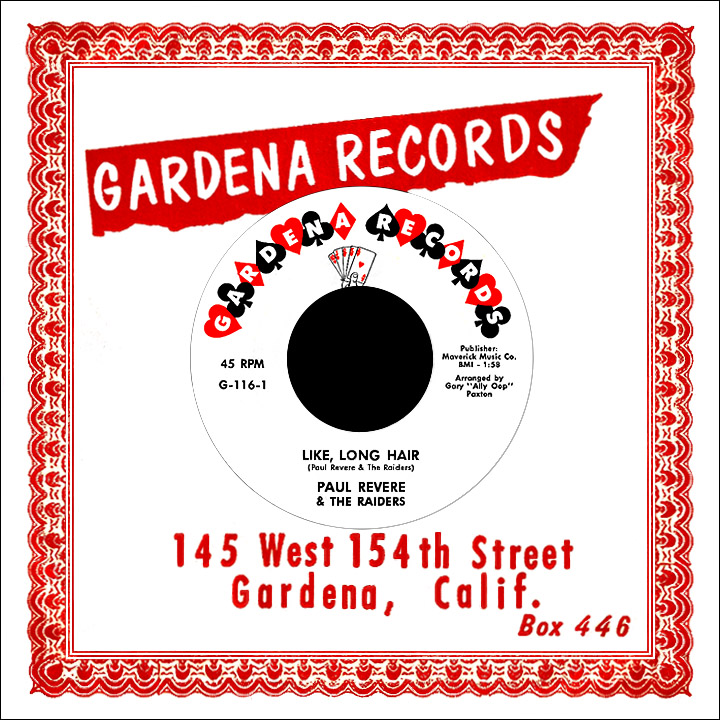"Beatnick Sticks" (a variation on the 1877 standard "Chopsticks" by composer Arthur De Lulli) was the first Paul Revere and the Raiders single on Gardena. Organist Revere led the band and saxophonist Lindsay sang on songs like "Paul Revere's Ride." Robert "Moonie" White (co-owner of the drive-thru) played lead guitar while his brother, guitarist Dick White, and drummer Jerry Labrum, completed the quintet. They began working in Los Angeles with Gary Paxton (fresh off his "Alley-Oop" chart-topper); the idea of arranging classics as rock numbers was further explored with "Like, Long Hair," based on Sergei Rachmaninoff's 1892 "Prelude in C-Sharp Minor." This third single hit the national charts and entered the top 40 in April 1961.