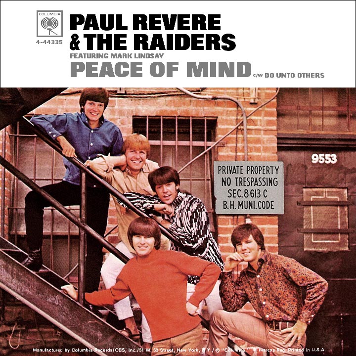 "Steppin' Out" marked a new phase for Revere's Raiders ('...don't lie to me!'); helped by some Action exposure, it climbed higher on the charts than any single since "Like, Long Hair." The next one was even bigger; a budding songwriter named Rick Day sent his song "Just Like Me" to Melcher, who wasted no time in getting a Raiders version on vinyl. The infectiously rocking track landed at number eleven in January 1966. While interviewing the group, Dick Clark mentioned a bet Mark had made that he would cut off his Continental soldier-era ponytail if the Raiders ever had a million-seller, pointing out that their first top ten, "Kicks," an anti-drug song penned by Barry Mann and Cynthia Weil, was getting close to the magic number. Eventually the ponytail disappeared. Another Mann-Weil tune, "Hungry" ('...I want the world now!'), likewise went top ten.