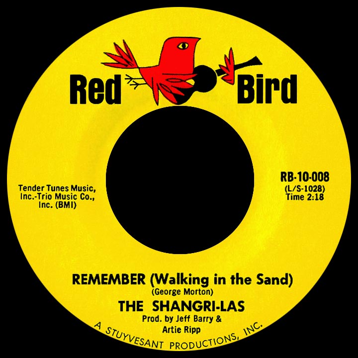The song swirling around in Shadow's maze-like mind was "Remember (Walking in the Sand)," which dealt with a rejected-and-heartsick young girl ('Oh, no...oh, no...oh, no, no, no, no, no'...what'cha think of those lyrics?) agonizing over memories of love lost. Heading back to Red Bird with a tape of the recording, he found Leiber, Stoller, Barry and the staff receptive; they decided to rework the song with the girls Morton had used on the demo, handing it off to staff arranger Artie Butler, who did the arrangement with Barry producing and Morton, who came up with the idea to add sound effects of seagulls, manning the sidelines. Mary, a very good singer who acted the part of the disillusioned protagonist with conviction, impressed everyone in the room; the other three supplied harmonic backup that suited the tone of the production. No time was wasted on getting it out to the public and the single spent most of September and October 1964 in the top ten.