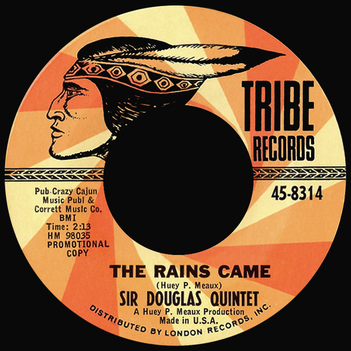 The Quintet included Jack Barber on bass, Frank Morin on saxophone, flute and harmonica, Johnny Perez supplying the beat, Augie Meyers on guitar, keyboards and accordion and, of course, lead singer "Sir Douglas," playing guitar while keeping other instruments in his bag of tricks close at hand. Guest spots on network television shows Shindig! and Hullabaloo made them familiar to viewers for a short time; successive singles "The Tracker" and "In Time" tanked, but the fourth Tribe single was a winner. "The Rains Came," a wet-weather-and-teardrops ballad, was written by Huey Meaux; the original version by Big Sambo (born James Young in Beaumont, Texas) and his band The House Wreckers reached the charts in 1962. Sir Doug's less-bluesy remake spent all of March 1966 in the top 40. The cover of their debut album, The Best of the Sir Douglas Quintet, depicted all five members in silhouette, perpetuating the previous year's British Invasion smokescreen.