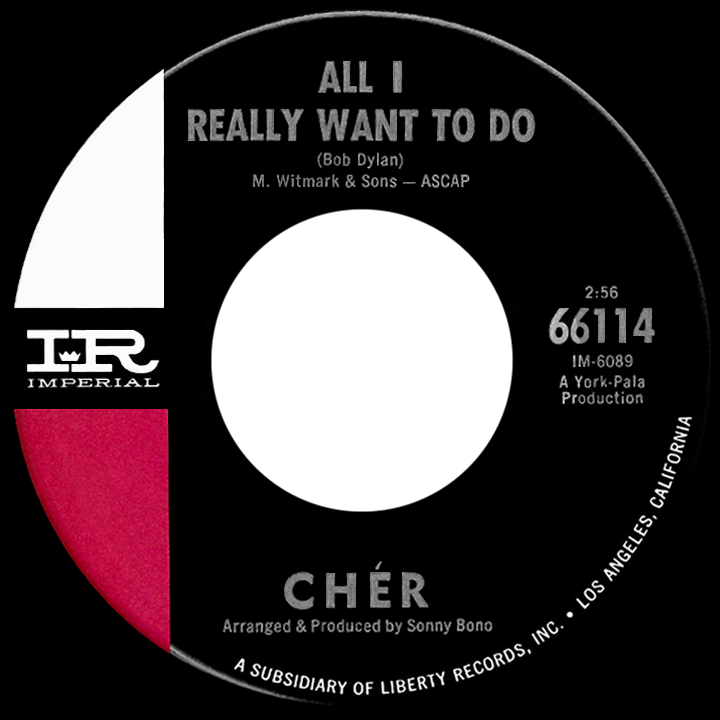 In the spring of 1965, Atlantic Records signed Sonny and Cher to their Atco label and released "Just You." Again, the single was a hit on the duo's L.A. home turf but didn't connect elsewhere. Having shortened the Cherilyn name for good, Cher recorded Bob Dylan's "All I Really Want to Do" for Imperial and it became the record that got her career rolling (simultaneously pummeling a promising version by L.A. band The Byrds in July). Just one week later, "I Got You Babe," another Sonny and Cher song of undying love, hit the charts on Atco and the two singles were suddenly racing up the charts in a welcome competitive coincidence. Both were number one hits in Los Angeles (first "All I Really" then "I Got You" the following week), while on the national charts Cher's single landed just shy of the top ten while "I Got You Babe," as most are aware, was a monster, spending three weeks at number one in August.