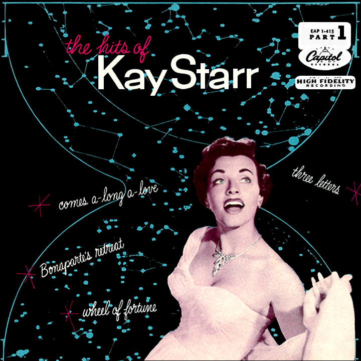 One exception was the summer '52 hit "Kay's Lament." Cowritten by Starr with Hal Stanley, the track featured a small jazz combo with a cool bongo beat and backing vocals by The Lancers ('Shout it, Sister Katy!'); it was blues and jazz rolled up into an R&B romp in the same vein as anything Washington or Ruth Brown was doing at the time. This and "Wheel" marked 1952 as the year Kay Starr was at the peak of her powers. In 1953 and '54 she stretched her categorical limits once again, venturing into gospel with "The Man Upstairs" and adapting a French opus, "Hymne a L'Amour," introduced four years earlier by Édith Piaf and retitled "If You Love Me (Really Love Me)." The two were released back-to-back and separately each was a top ten hit.