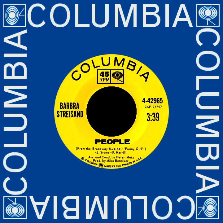 The hit take of "People" concluded the like-titled LP (her seventh, counting the Broadway-based albums); it was her first number one seller at the end of October while the previous four remained in the chart's top 100 (even The Beatles couldn't make this claim with their five American LPs). A "Funny Girl" single (not connected to the show) peaked mid-chart at about the same time (Merrill and Styne wrote it as well as the flip, "Absent Minded Me"). The Grammy love continued when "People" got her a second consecutive win in the Vocal Performance category the following April, just before she stepped under a much larger spotlight than Manhattan island could offer: the entire U.S.A.
