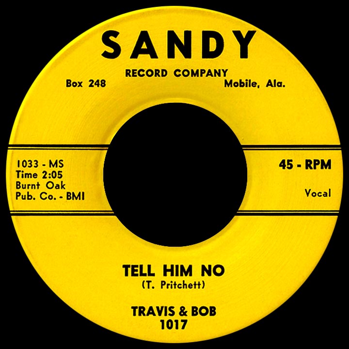 The Sandy label of Mobile, Alabama released about 40 records between 1957 and 1962, plus a handful of others on two subsidiary labels. The artists were mostly country singers and rock and rollers, yet only one record in all that time, a song influenced by The Everly Brothers called "Tell Her No," was a national hit. The song's originators, Travis and Bob, became something of an overnight success, carrying the momentum through the song's chart run in the spring of 1959 but not much further. After that it was just one disappointment after another until the frustrated duo split up about two years later.