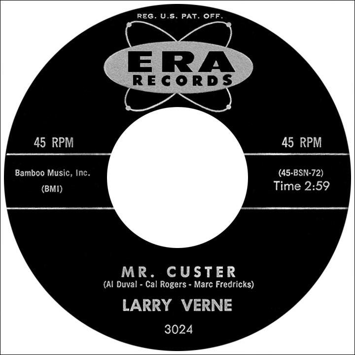 The Battle of Little Bighorn took place in Montana on June 25, 1876; U.S. Army troops of the 7th Cavalry were wiped out by overwhelming numbers of Lakota and Arapaho Indian warriors. Lieutenant Colonel George Armstrong Custer, who died with his troops, made several errors in judgment that led to the massacre. Throughout the years, singers and pop music composers have created songs about such occurrences that could be termed "Historical Hits," several of them popular in 1959 and 1960, a trend sparked by Johnny Horton's chart-topping smash "The Battle of New Orleans." Others include Stonewall Jackson's "Waterloo," which mentions Napoleon Bonaparte's legendary defeat, several songs by Marty Robbins about actual and fictional wild western events, and many more by Horton. "Comanche (The Brave Horse)," a track on the album Johnny Horton Makes History, references the conflict at Little Bighorn; according to the liner notes, the valiant steed "...was the sole survivor of all the forces in Custer's Last Stand." It's likely no one had the nerve to do a comedic take on the military tragedy...until a song you might cautiously call a "Hysterical Hit," "Mr. Custer" by Larry Verne, hit the airwaves in 1960.