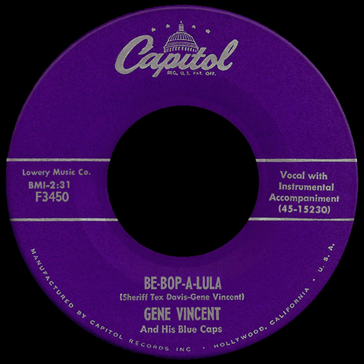 As Elvis's "Heartbreak Hotel" reached the top of the charts in the spring of '56, record labels began frantically searching for Presley successors. Tex was able to get an audition for Gene with Ken Nelson, an A&R man and producer for Capitol Records. He was signed immediately and recorded his debut single in Nashville in May. "Be-Bop-A-Lula" ('...she-e-e's my baby now, my baby now, my baby now...') was backed with "Woman Love," a steamy midtempo tune penned by country pro Jack Rhodes and Capitol staffer Dick Reynolds that caused a minor controversy (Gene's pronounciation of the word 'huggin,' to some ears, sounded like it started with an 'f') and the "depraved" track was instantly banned by quite a few radio stations. But the A side prevailed (and I 'don't mean maybe'); it reached the top ten in July, hitting its peak at number seven the same week Presley's "I Want You, I Need You, I Love You" became his second number one hit. Many listeners mistook Vincent for the chart-topping star; even Elvis's mother, Gladys Presley, was fooled when she first heard it!
