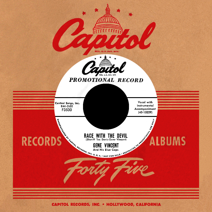 Follow-up "Race With the Devil" (another song penned with Graves that gave credit to Davis) is a fast-paced rocker, its satanic protagonist ('...here come the devil doin' a hundred 'n' one!') suggesting some drivers were reckless and/or evil. The subject matter may have been a little too bold; the single stalled in the lower ten of the Top 100. The record was more successful in the U.K., hinting at what the future held. Flip side "Gonna Back Up Baby," written by unsung rocker Danny Wolfe, was an A-side-worthy scorcher in its own right. Gene mounted a series of successful, often extended, tours with his rough-and-tumble Blue Cappers. As with Elvis and other rock and rollers, parents disapproved en masse while youthful concertgoers loved the unrestrained fun of it all. After a stretch, Gallup and Williams cracked under the pressure of the constant traveling and quit the band (though Gallopin' Cliff continued contributing to Gene's studio sessions). North Carolinans Russell Williford (lead guitar) and Paul Peek (rhythm guitar) took their places and the rock kept rollin'. Fall release "Bluejean Bop" (and its uproarious flip "Who Slapped John") was another strong two-sider that again, frustratingly, fared better in England.