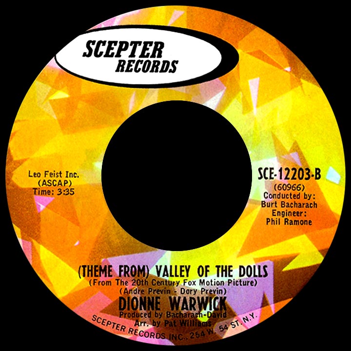 1967 went against the odd-year curse (noting that '66 and '68 were stronger years overall) with "Windows of the World" and the smash "I Say a Little Prayer," her biggest yet. Then in December, Valley of the Dolls was released to theaters, lambasted by critics but a huge box office success. The movie had one thing going for it: good music. Dionne's "(Theme from) Valley of the Dolls," the flip side of "Prayer," took the single up the charts a second time, where it spent part of February and most of March 1968 at number two, topping the single's A side as her new biggest hit yet. Written by the husband-and-wife team of Andre Previn and Dory Previn, it was the first hit in nearly three years that hadn't been written by Bacharach and David.