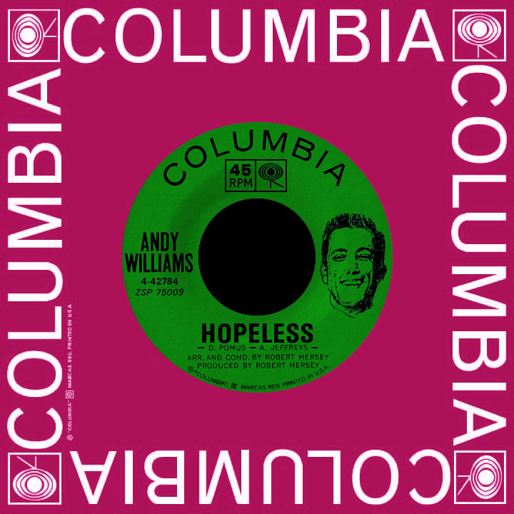 Of the many singles he recorded for Columbia aimed specifically at pop radio, his peak came in the spring of 1963 with the chart-topping "Can't Get Used to Losing You," which featured an attention-grabbing staccato string arrangement. Written by Doc Pomus and Mort Shuman, it was a departure for Andy, as the talented team normally functioned outside the usual circle of his contributing songwriters; the duo had built a reputation writing hit songs for youth-oriented acts like The Drifters, Connie Francis, Dion and the Belmonts and Elvis Presley. The record's success at top 40 upgraded his status as an album seller; it was included on the LP The Days of Wine and Roses (a Mancini movie song on the B side of "Can't Get" and a top 40 hit in its own right), which spent more than three months on top of the album charts from May through August '63.