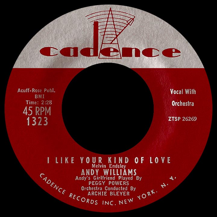 Peggy Powers (real name: Carmen Montoya) had broken into the big time, or so it seemed, in the fall of 1952 as a singer with Sammy Kaye (the "Swing and Sway" bandleader). The job led mainly to off-and-on session work, culminating in her role as "Andy's Girlfriend" on Nashville-based songwriter Melvin Endsley's cute-and-cuddly "I Like Your Kind of Love," top ten in July '57. Immediately after the one-shot pairing, she backed The Kirby Stone Four on the group's only single for Cadence, "Raven" (playing the Poe-inspired title bird, her main vocal contribution was...what else? 'Nevermore!') After that she sang with the Dick Jacobs orchestra and later made her living as a voice coach in New York City.